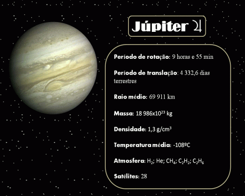 É o planeta do Sistema Solar este planeta possui um núcleo dentro formado por gelo e corpo rochosos. Em volta desse núcleo deve existir uma grande camada de hidrogênio envolvido pela atmosfera bastante espessa. Quando se observa os planetas por um telescópio, ele parece um disco amarelo com duas faixas mais escuras em toda a volta. Júpiter possui cerca de 28 satélites, como por exemplo Ganemede, Europa e Calisto.