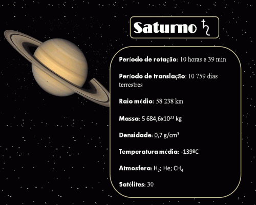 É o mais belo de todos os planetas, devido a existência de anéis. Esses anéis são formados por inúmeras partículas de gelo ou fragmentos rochosos. Para além de seus anéis, Saturno tem muitos satélites como: Titã que é muito parecido com Júpiter em termos de constituição e estrutura.